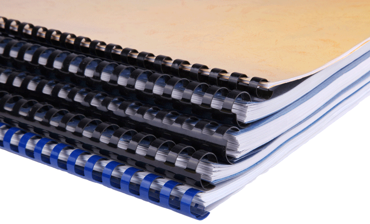 Similar to spiral binding, Comb Binding is a good choice for larger size documents that must open flat on a work surface. Cook Books, Educational Materials, and Manuals are often bound this way. While everyone has their own preference, Comb Binding is not often the first choice for presentational documents, and color choices are limited.